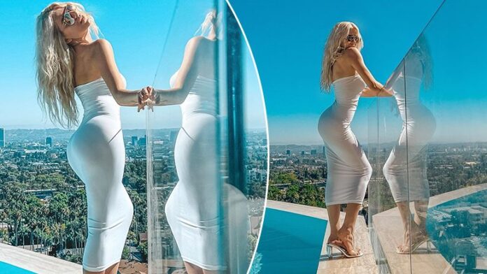 Krahas këtyre imazheve, ajo ka sjell edhe disa fotografi të saj të realizuar pranë një pishine, ku duket mjaft tërheqëse e veshur me një fustan të bardhë.