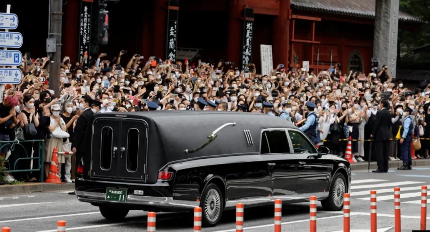 Autokolona me makinën e vdekjes që mbante trupin e tij, e shoqëruar nga gruaja, Akie Abe, kaloi ngadalë përmes turmës së njerëzve.