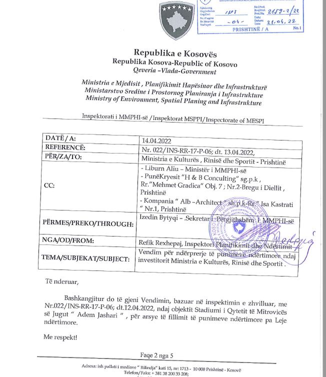 Periskopi ka parë që më 21 prill 2022, Inspektorati i Ministrisë së Mjedisit e ka urdhëruar Ministrinë e Kulturës që menjëherë të ndërpresë të gjitha aktivitete e ndërtimit në Objektin e Stadiumit “Adem Jashari” në Mitrovicë, pasi punët kanë qenë duke u realizuar pa leje.