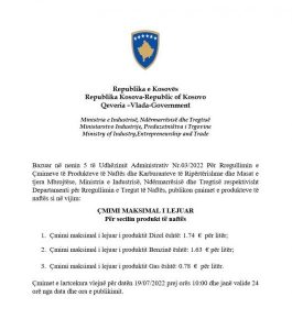 Siç njofton ministria, çmimi maksimal i lejuar për secilin produkt të naftës është si në vijim.