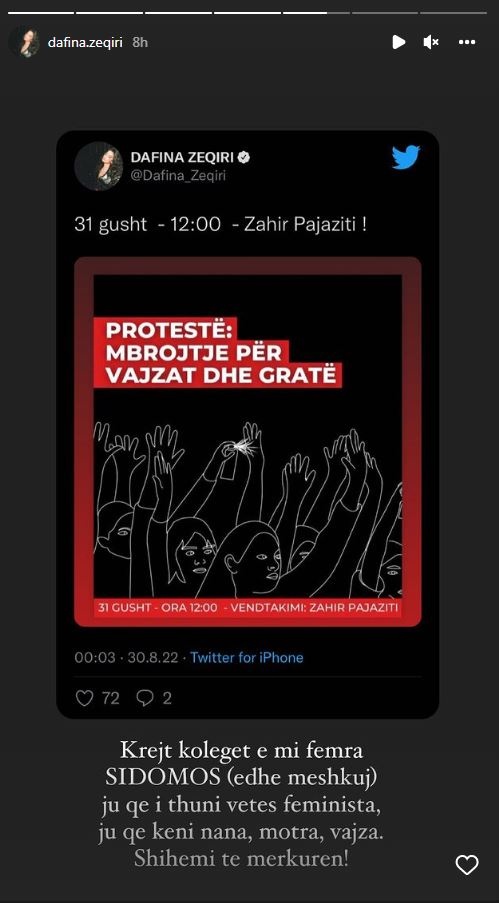 “Ju që i thuni vetes feminista, ju që keni nana, motra, vajza. Shihemi të mërkurën”, ka shkruar Duffye.