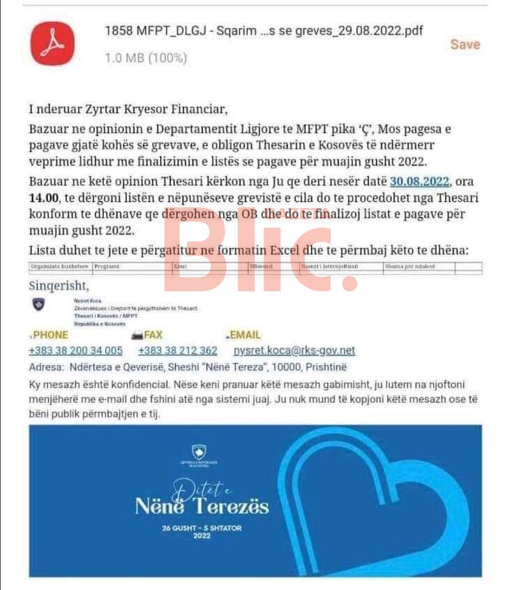 “ I nderuari zyrtar kryesor financiar – bazuar në opinionin e Departamentit Ligjor të MEFT pika “ç”, mos pagesa e pagave gjatë kohës së grevave, e obligon thesarin e Kosovës qëtë ndërmmerr veprime lidhur me finalizimin e mistës së pagave për muajin gusht. Bazuar në këtë opinion thesari kërkon nga Ju që deri nesër datë 30 08 2022ora 14:00 të dërgoni listën e nëpunësve grvistë e cla do të procedohet nga Thesari konform të dhënave që dërgohen nga OB dhe të finalizoj listat e pagave për muajin gusht. Lista duhet të jetë e përgatitur në formait Excel”, thuhet në kërkesën e Thesarit dërguan komunave të Kosovës, të cilët ka arritur ta siguroi Gazeta Blic.