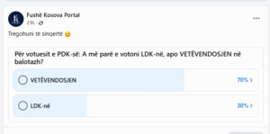 Sipas sondazhit me pyetjen: “Votues i PDK-së, cilën parti do ta votosh në balotazh?”, rezultatet kanë qenë si më poshtë: 70 % e të anketuarve janë shprehur se do të votojnë për Vetëvendosjen,ndërsa 30% kanë deklaruar se do të mbështesin Lidhjen Demokratike të Kosovës (LDK).