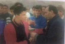 Foto nga koha e rezistencës: Agim Ademi duke dorëzuar Kupën e 28 Nëntorit në...
